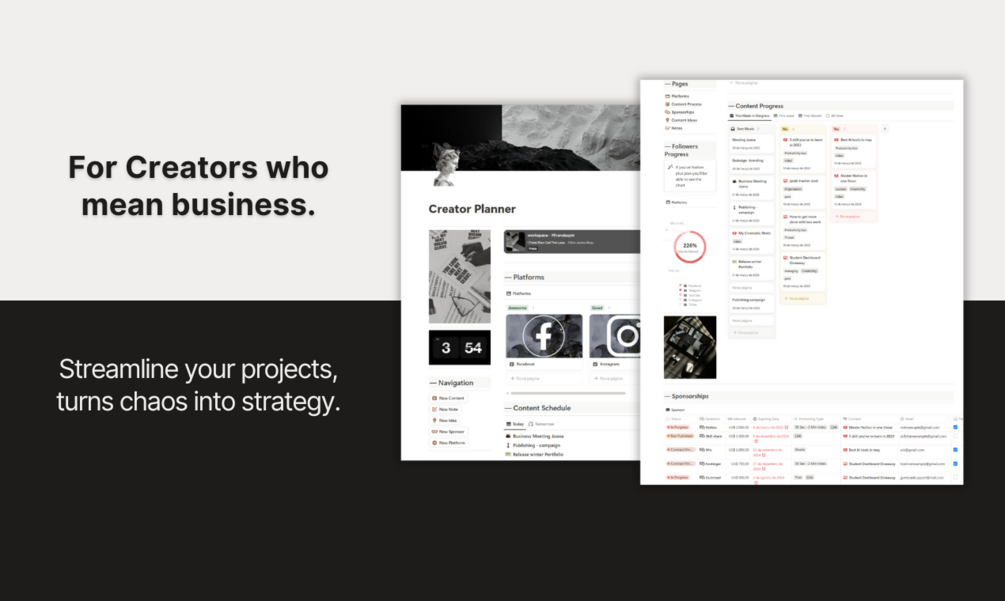 This Free Notion Template can track your projects automatically, manage your social media platforms, and visualize your follower goals with intuitive graphs.